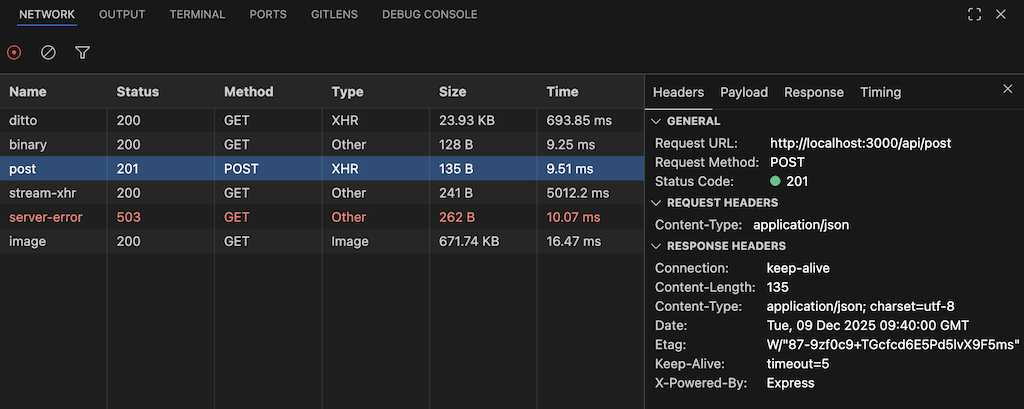 Clicking on the network log shows more details about the contents of the request. The details of the request are grouped into into Headers, Payload, Response, and Timing tabs.